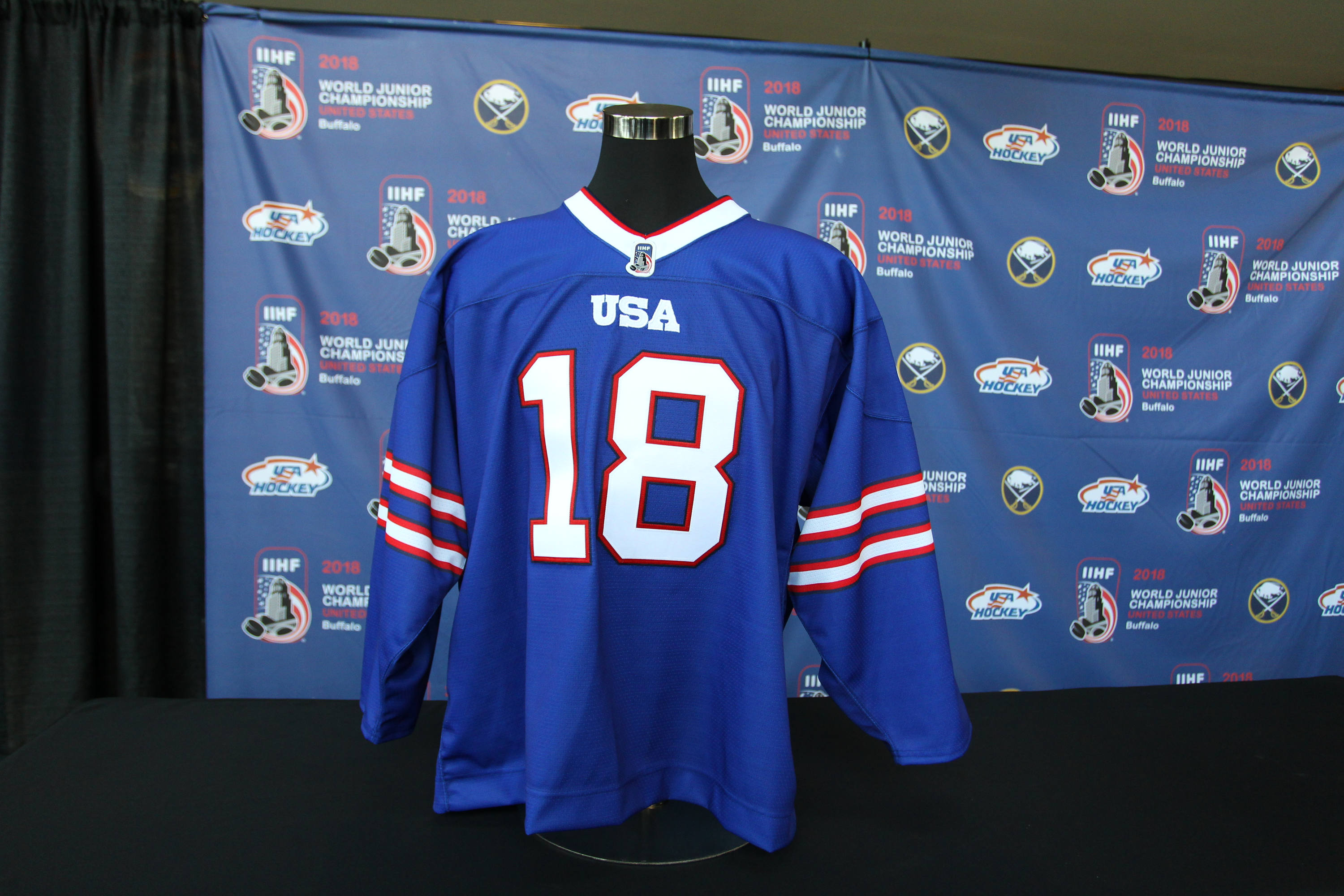The jersey was unveiled at a press conference hosted by USA Hockey at KeyBank Center on Wednesday morning. Eight and 12-game ticket packages for the 2018 World Junior Championship and the return of the CCM/USA Hockey All-American Prospects Game to Buffalo were also announced.